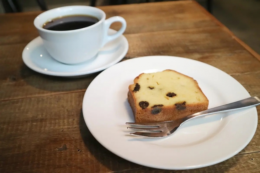 スタンダードブレンドコーヒーとパウンドケーキ。ブレンドコーヒーはスタンダードと、ちょっと濃い目のストロング、そしてギリギリまで深く焙煎したフレンチの3種類がラインナップされています。