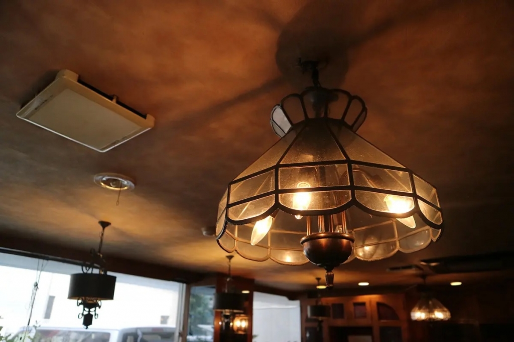 店内をほのかに照らしているのが天井に設置されたレトロ感満点の照明。独特の形状はノスタルジックかつ美しささえ感じさせてくれます。