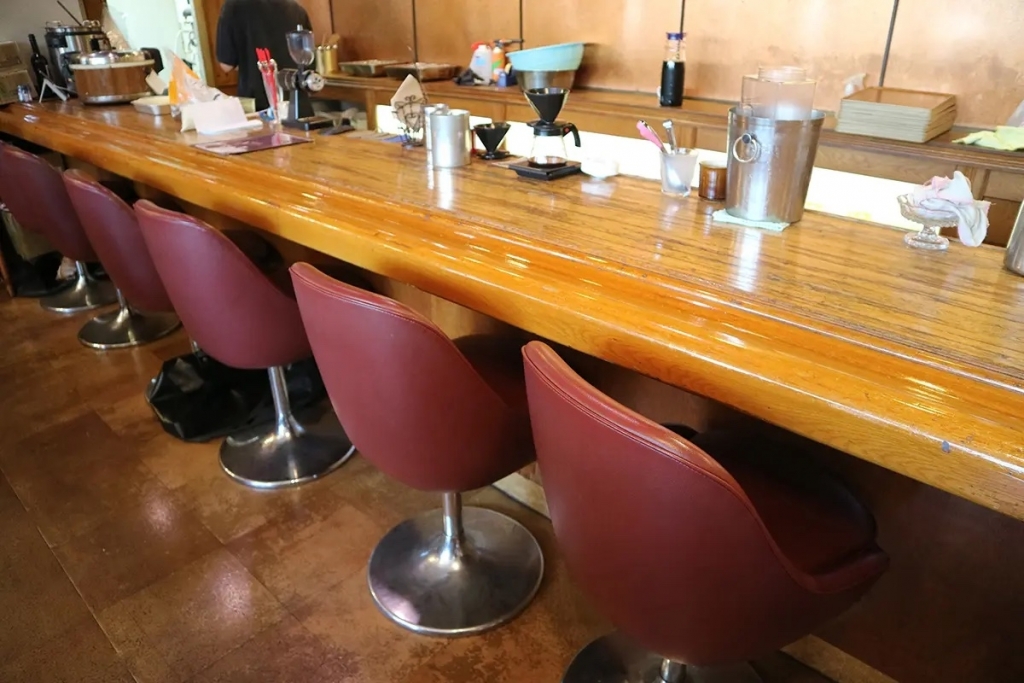 一枚板のカウンター席。背もたれのある回転式のスツールとの組み合わせは、昔ながらの喫茶店らしいスタイルそのまま。