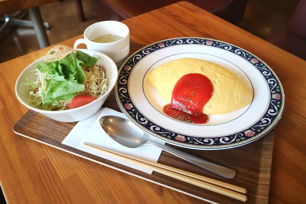喫茶メニューの王道「オムライス」。ラグビーボールを連想させるような両端がほんのり尖った可愛いフォルムのオムライスは見た目も素敵。サラダもなかなかのボリュームで食べ応えあり。