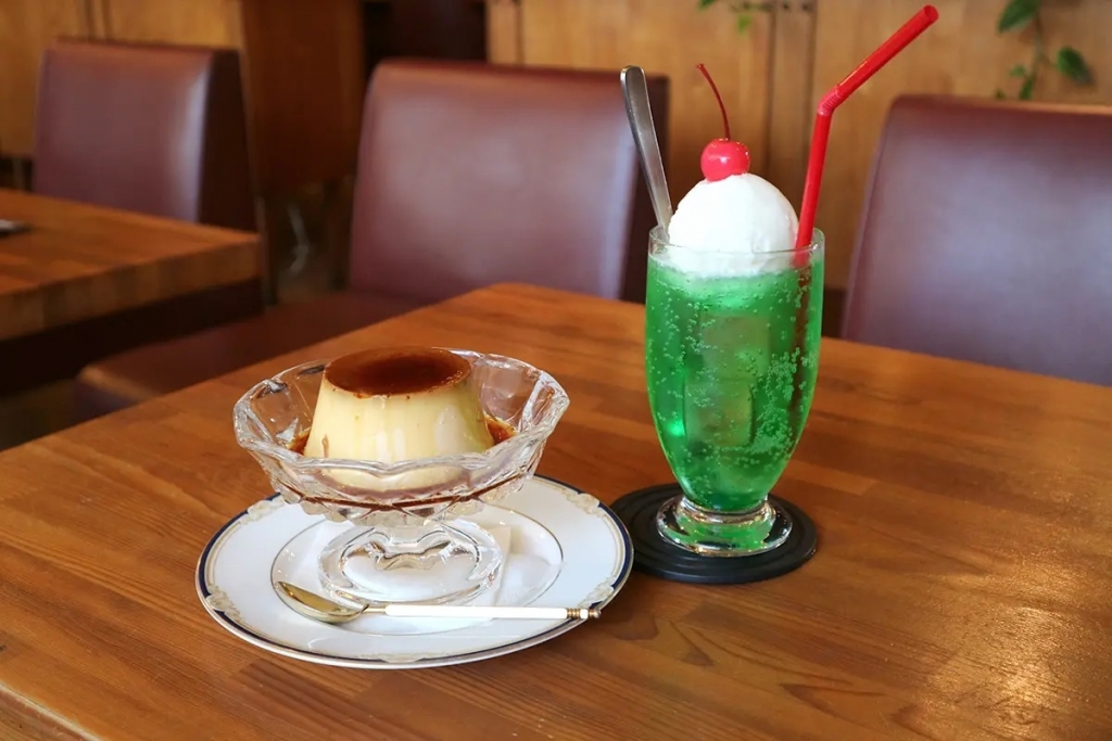 食事だけではなく、懐かしさあふれるドリンクやデザートもラインナップされています。こちらは人気の「プリン」と「メロンクリームソーダ」。レトロで愛らしいルックスは、写真映えすること間違いなし。