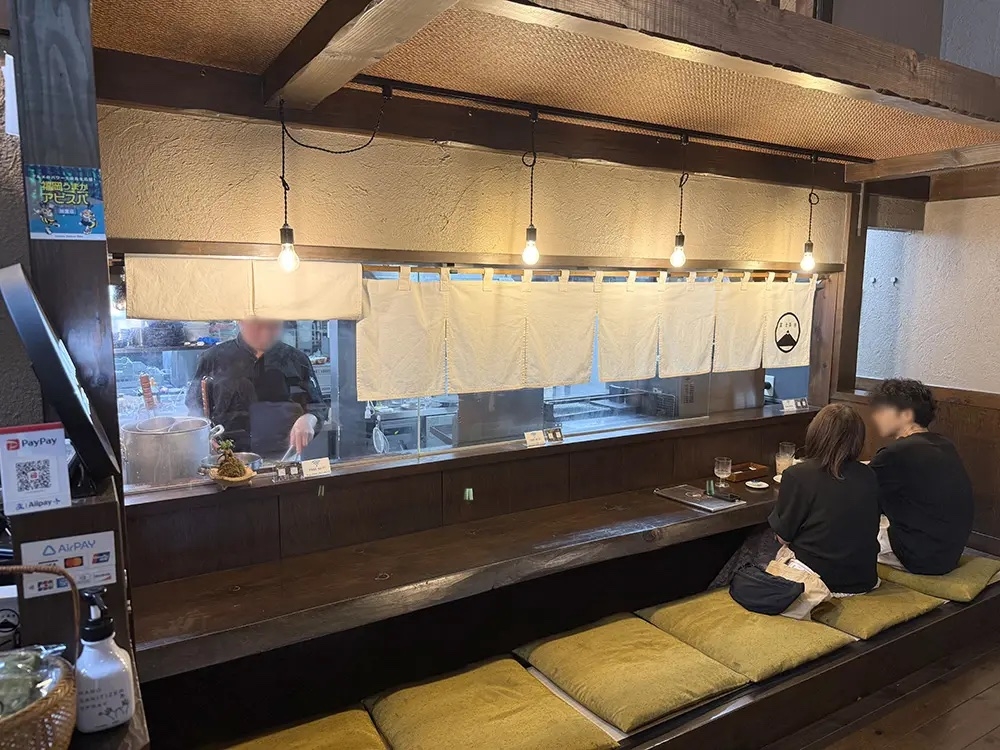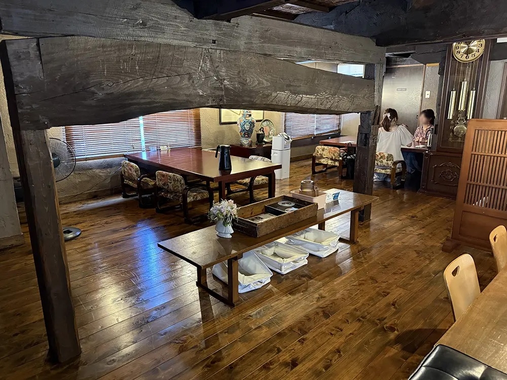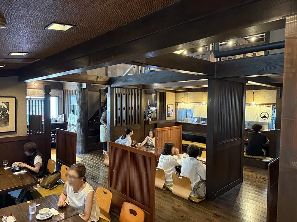 店内は座敷席になっており、入り口で靴を脱いで入店するスタイル。店内は太い梁と板張りのフロアで構成されています。