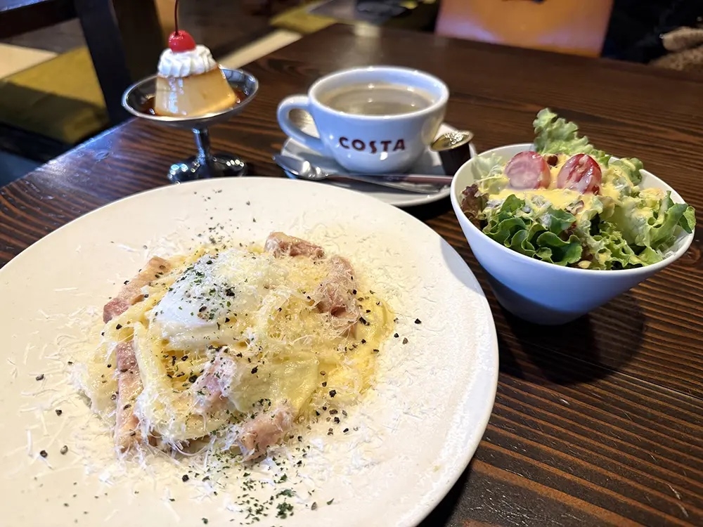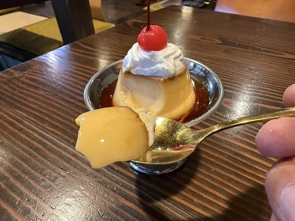 ランチはオプションでサラダやスイーツがつけられます。こちらのプリンは銀色の足つきカップで提供され、昭和レトロ感満点です。