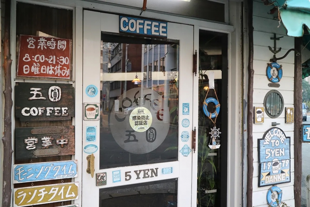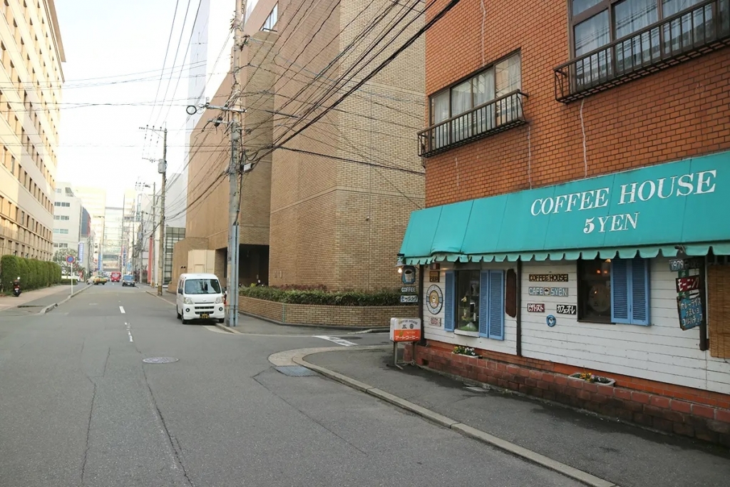 「喫茶五圓」は博多駅博多口から歩くこと5分。目貫通りである「はかた駅前通り」を一本入った通り沿いにあります。まわりの近代的なビル群と相反して、まるでここだけ時が止まっているかのように佇んでいます。