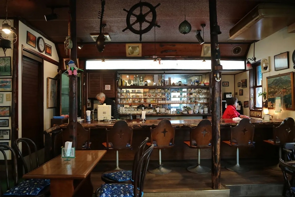 ドアを開けるなり目に飛び込んでくるのは、これぞまさしく「ザ・昭和の喫茶店」というべき空間。店内はカウンター席とテーブル席に分かれており、色褪せて所々補修された椅子やテーブル、古びたインテリアはどれも年季が入ったものばかり。