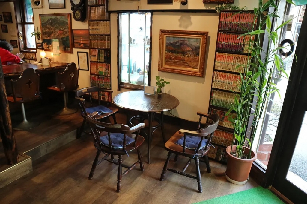 本棚には喫茶店のマストアイテムであるコミック本も充実。「サラリーマン金太郎」「バカボンド」など、近隣のビジネスマンに配慮しているかのような、男臭い硬派なセレクトになっています。