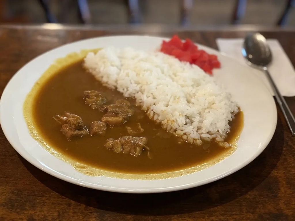名物のカレーは牛肉メインのシンプルな自家製カレー。サラサラのルーをスプーンですくって、ご飯とビーフを乗せていただきます。スパイシーな味わいは、これぞ昭和の喫茶店の味!添えられたたっぷりの福神漬けもいいバランスです。