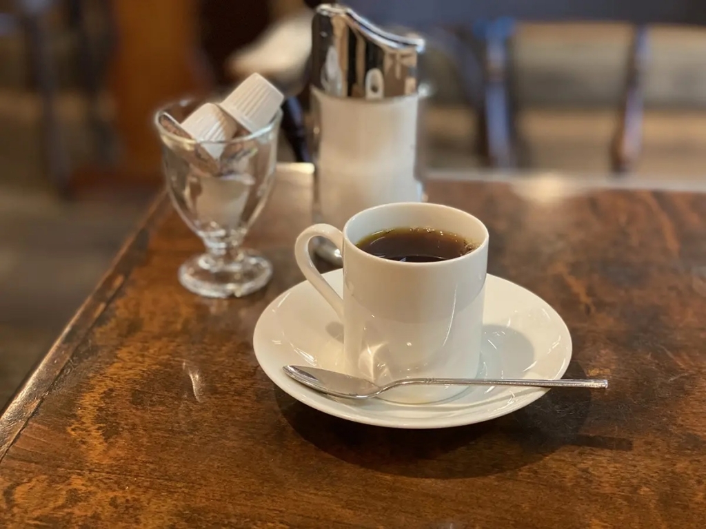 食事セットのコーヒーは小ぶりのかわいいカップで提供されます。片手で入れるスタイルのシュガーポットも昔懐かしいアイテム。食後の一杯をいただきながらノスタルジックな空間を楽しみましょう。