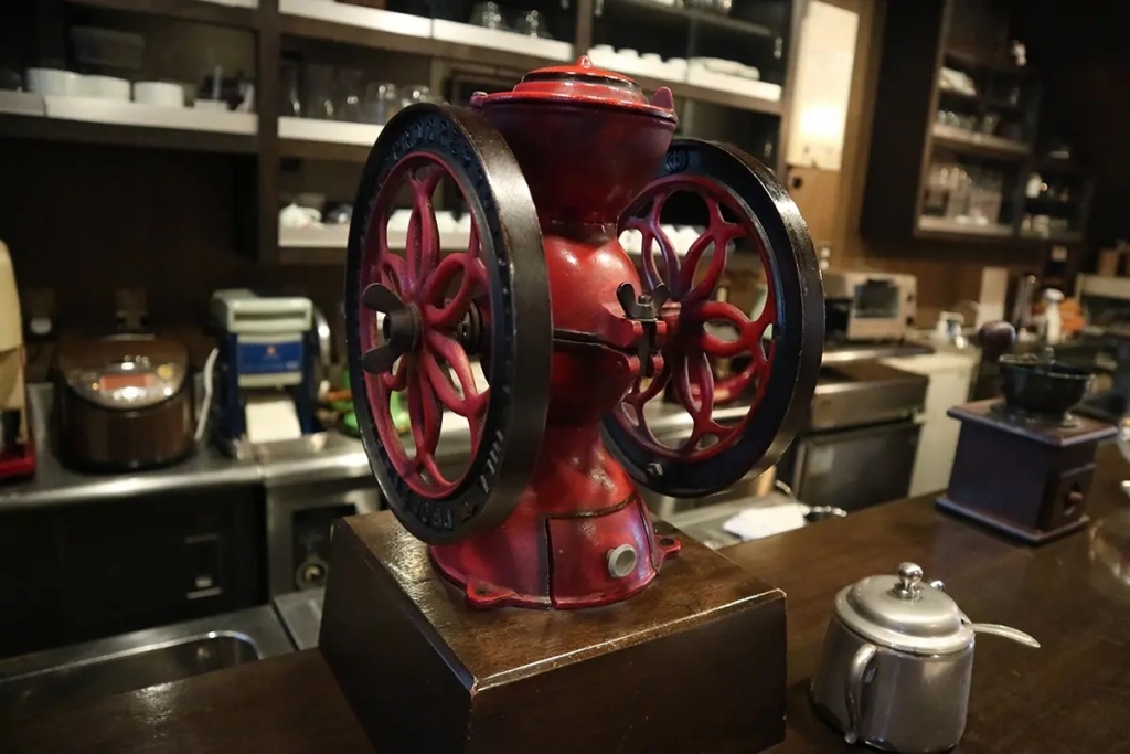 店内を彩る絵画や骨董品などのアイテムは先代店主のコレクション。このオールドスタイルのコーヒーミルは現在オブジェとしてカウンターの一角に鎮座しています。