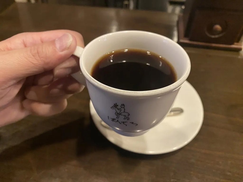 「ばんぢろ方式」で抽出したコーヒー。鍋にオリジナルブレンドのコーヒー粉と水を入れて煮込んでコーヒーエキスを抽出し、さらにそれをネルでドリップするという珍しいスタイルのコーヒー。深いコクとまろやかさが両立した個性的な味は、まさに「歴史を感じる一杯」なのです。