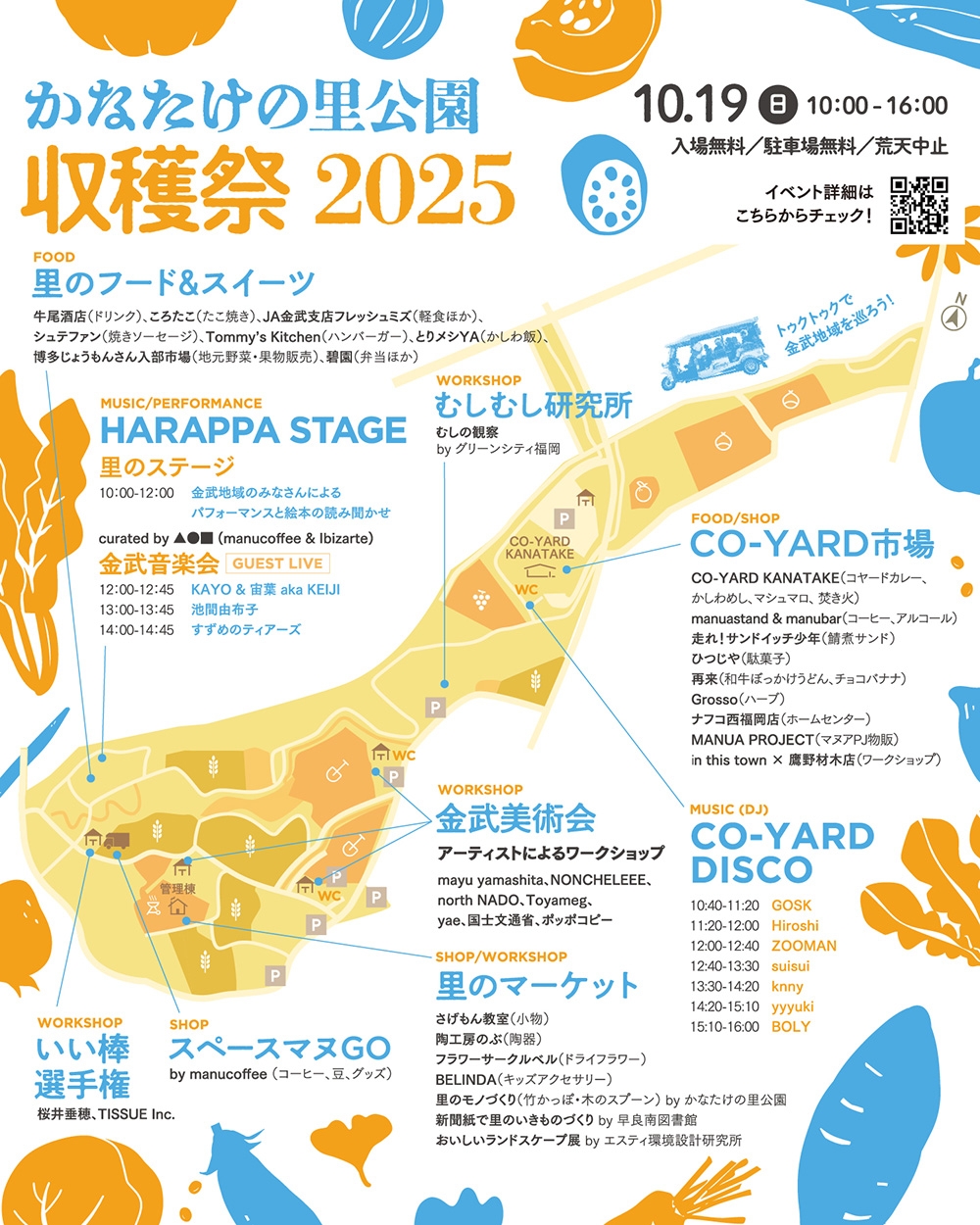 manucoffeeとIbizarteがキュレーションする「金武音楽会」では、すずめのティアーズ、池間由布子、KAYO & 宙葉 aka KEIJIが登場。ほかにも福岡を拠点に各地で活躍するクリエイターやアーティストを先生に迎えたワークショップ企画「金武美術会」や、地域の美味しいものや自慢の品が勢揃いする「里のフード&スイーツ/マーケット」、ゲストフード出店に植物販売、ワークショップが楽しめる「CO-YARD市場」などなど、さまざまなコンテンツがラインナップ。