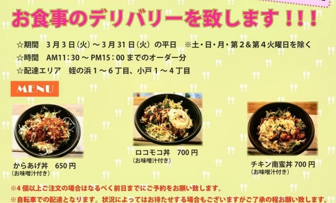 福岡市西区姪の浜の「midori食堂」が、2020年3月のみの期間限定で、姪の浜・小戸エリアを対象に「お食事のデリバリー」を致します!◎期間:3月3日(火)〜3月31日(火)の平日(※土・日・月・第2&第4火曜日を除く)…