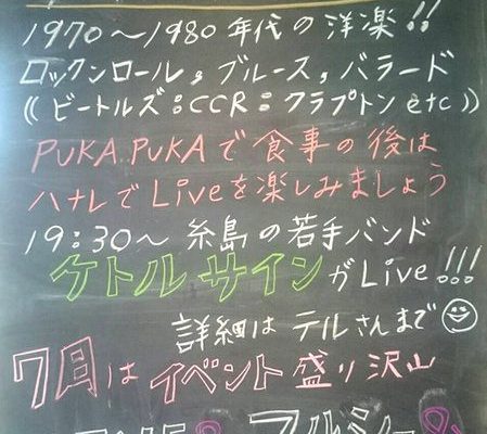 来週はいよいよ7月!本格的な夏の到来までもうすぐですね♪本日は福岡市西区今津にある「プカプカキッチン」の7月のイベント情報をお知らせします!★7/2(土)テルバンドLIVE!20:30よりスタート!ロックンロール・ブルース・…
