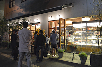 | 80名以上の方がデイライトキッチンに押し寄せると、普段は広く感じる店内もぎゅうぎゅうに。テーブルに並んだビュッフェ料理のまわりにはあっという間にたくさんの人だかりが出来ました。第一部終了後に帰京した塚本さんに替わり、第二部の司会を勤めるのはデイライトキッチンの福田店長。この日提供されるビュッフェ料理のメニューをアナウンスしたり、参加者にマイクを向けたりと、会場を賑やかに盛り上げてくれました。 | ||