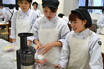 | さあ、お次はいよいよ学生がチャレンジ!まずはスロージューサーでのコールドプレスジュースづくりから。このスロージューサー、ジュースと搾りかすが分かれて出てくるんですが、その搾りかすが「うにゅにゅにゅ」っと出てくるのが学生たちの笑いのツボに入ったようで…(笑)。終始なごやかムードで授業は進みます。 | ||