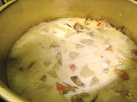 鍋を弱火にかけ、時々混ぜながらもう15分程お好みのとろ みがつくまで煮込み、味をみて、塩・ブラックペッパー少々で整えます。 もし、とろみが強いようなら、牛乳を足しながら調節してください。 |