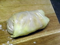 くるくると最後まで巻いたら、残りの片端を内側に押し込むようにして、キャベツを固定する。(上手に巻けな い時は、爪楊枝を使用) |